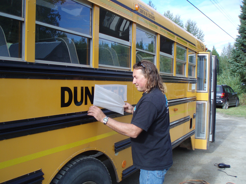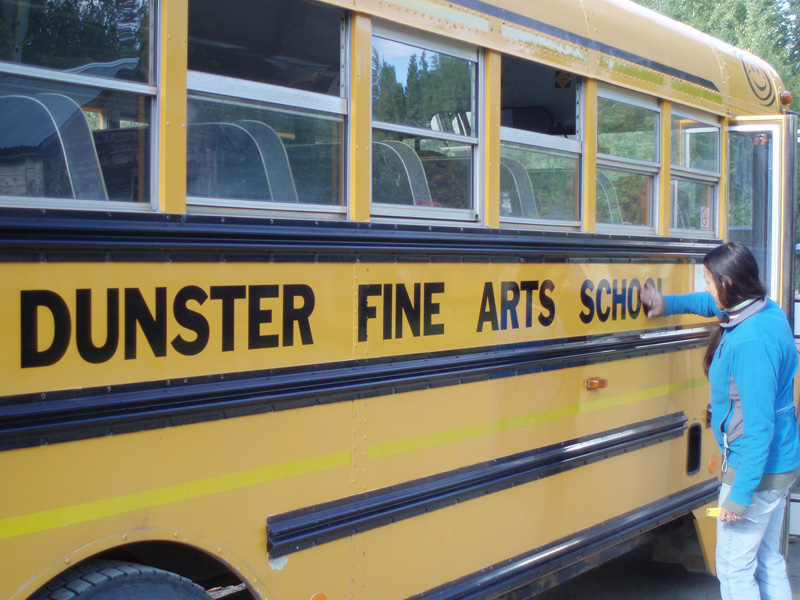 A sense of pride seemed to sweep through the small crowd of protesters as Dunster Fine Arts School parent Terry Cinnamon peeled off the covers of black vinyl lettering on the new bus. “Dunster Fine Arts School” the crowd read aloud, with approval and hope beaming from their faces.