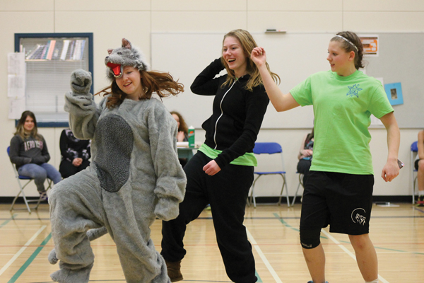 Below right: durning half time for most of the games, Valemount’s Timberwolf mascot – aka Cypris Arnston – led a dance routine with players and audience menbers joining in.