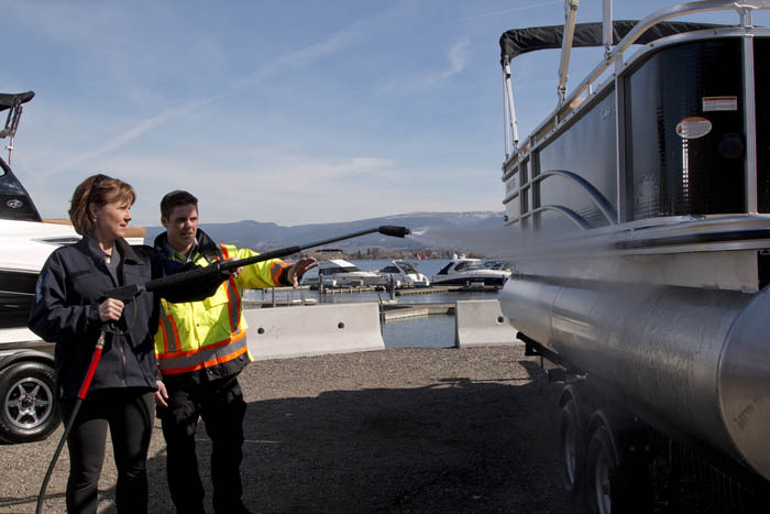 BC Premier Christy Clark pitches in, pressure-washing watercraft to dislodge any mollusc hitchhikers.