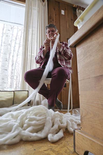 Top right: All that will become a neat pair of mittens. Grace Michaud bravely begins her mitts at the alpaca mitten making workshop in Tete Jaune this weekend.