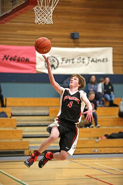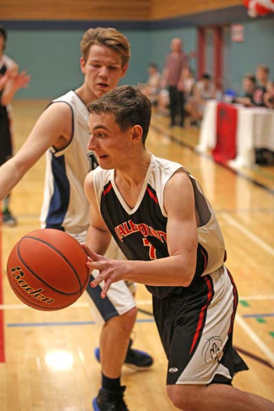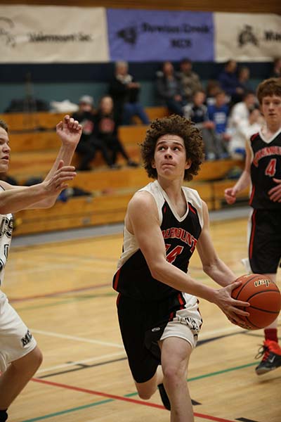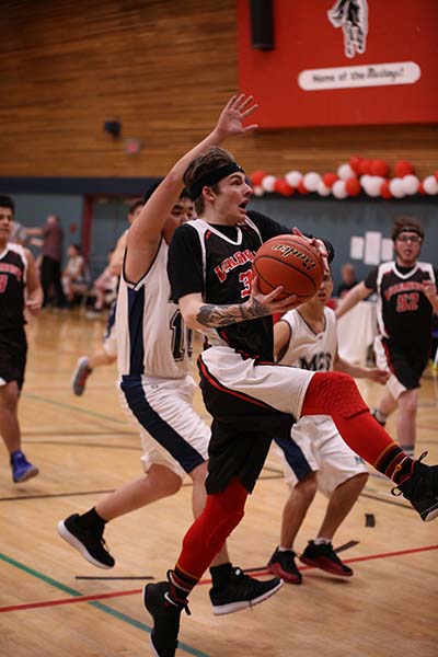 Lucas Bergen gets some air on his way to the hoop, he and the Timberwolves led by Eston Bustin trounced Mountain Christian from Dawson Creek.” Tavish Swets, the backbone of McBride’s magnificent Mustangs shows his pipes and how he can use them, tired and triumphant Mustangs were victorious. It’s the end of the seasons for the ‘stangs and so too for Stephen Kalnin who is the only Grade 12 on the team, Bernhardt DuToit makes a baseline run for the wolves, Noah Keim dribbles full throttle down the court.